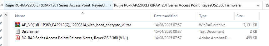 Hello Support I have a RAP2200(E) Access Point and firmware dont want to update from ruijienetworks portal I even tried manually update - download firmware and upload to Access Point. Current firmware ReyeeOS 1.249.1308 New Firmware ReyeeOS 2.380.0.2227;AP_3.0(1)B11P380,Release(12222716) (dont want to update) |