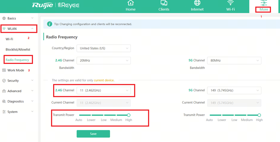 The signal strength can also be checked on a client device if you have Ruijie Reyee APP install on your mobile phone. When conducting the speed test, it is best to sure the testing device has signal strength above -65dbm.