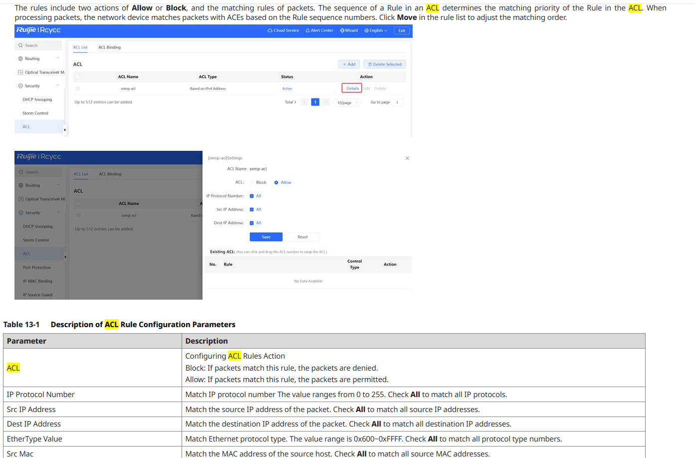Hello sir, the NBS5200-24SFP/8GT4XS supports extended ACLs. Please refer to the device's configuration documentation for details:https://reyee.ruijie.com/en-global/support/documents/slide_rg-nbs3200-series-switches-reyeeos-2340-configuration-guide/?page=html&keyworks=ACL#_Toc210914067![]() |