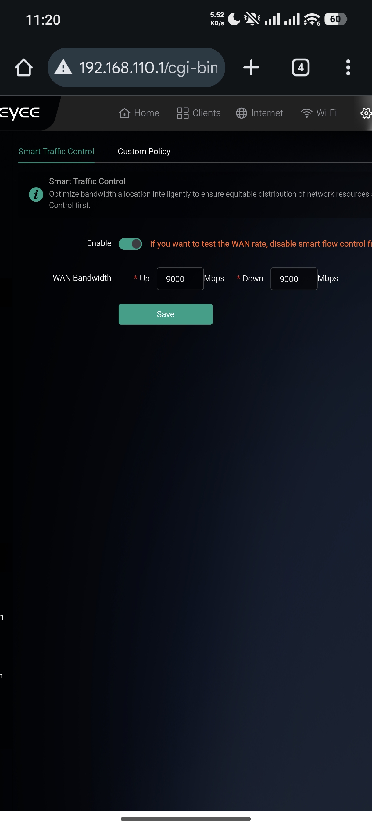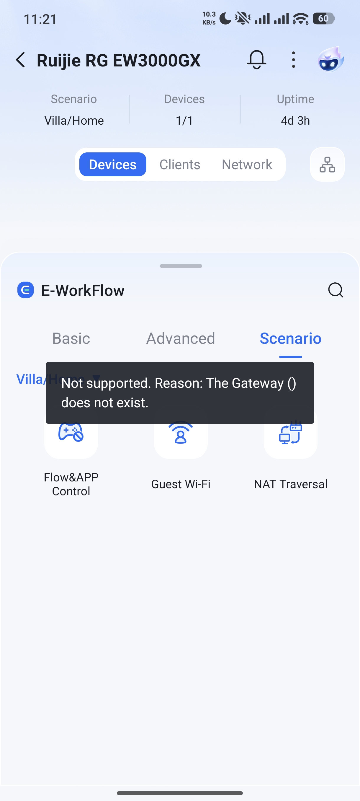 Hello, I see you have an EW3000GX device, the reason you see that message is because your device is a home router. Not all features on the APP are compatible with all the devices, some features are preloaded to use with other devices, like a gateway or switch. If you want to set Smart traffic control, it can only be configured connecting to the EW by using an eWeb tunnel or by connecting locally using the IP of the device. Based on the first capture you shared, the features is already enabled, you just can't see it from the App. Best regards. |