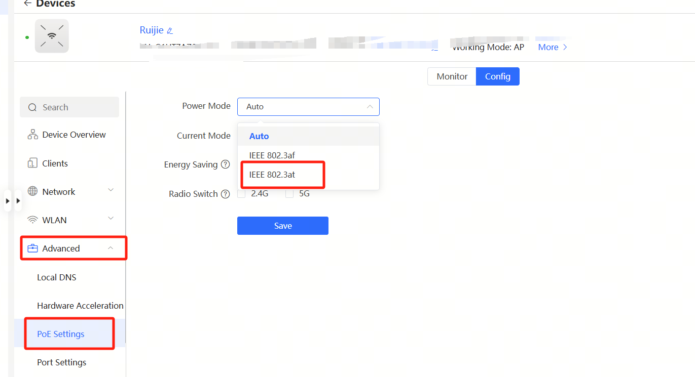 Sir, may I know what power supply mode you have currently selected for the AP? Can it be modified to 802.3at? Is there any alarm in the AP?