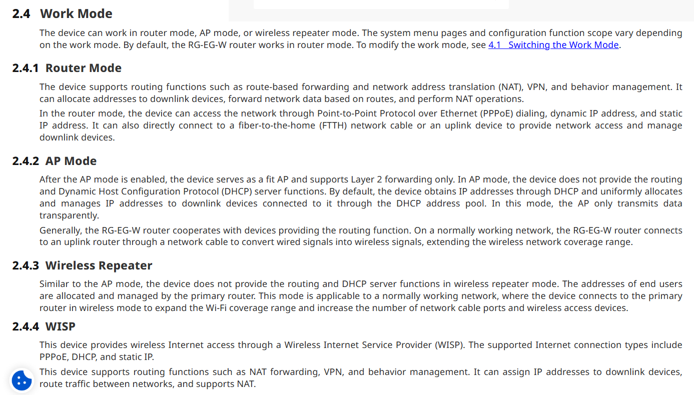 Hello, the device model RG-EG105GW-X is a wireless router, as long as one of them is in AP mode, your goal can be achieved (it's not recommended to have 2 devices working in router mode). Here you can find more information about the working modes: https://reyee.ruijie.com/en-global/support/documents/slide_ruijie-reyee-rg-eg-w-series-wireless-routers-reyeeos-2-380-configuration-guide/#_Toc216452634 ![]() Regards. |