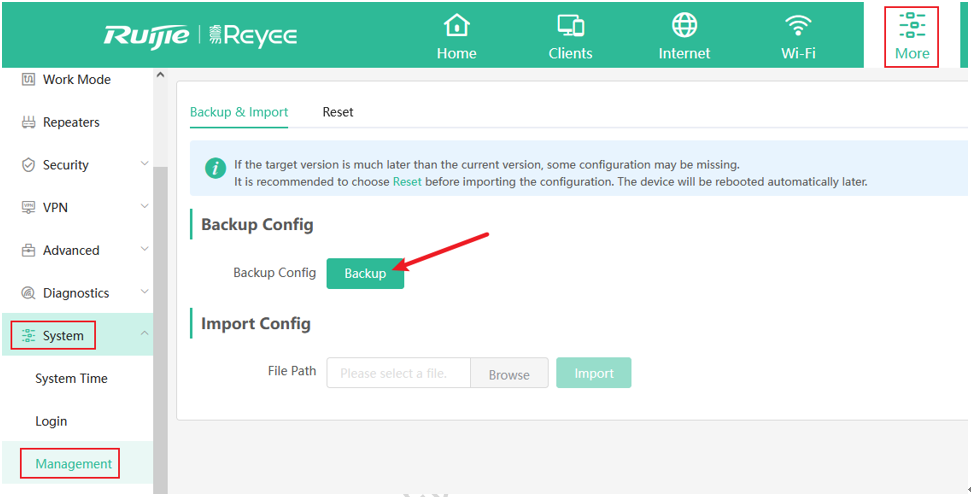 You can follow these steps to configure ConfigBackup and Import Config on Reyee EW series router: 1.Login to the eweb page of Reyee EW router. 2.Choose More> System > Management, click Backup button to download a configuration file locally. ![]() 3.Click Browse, select a configuration file backup on the local PC, and click Import to import the configuration file. The device will restart. ![]() |