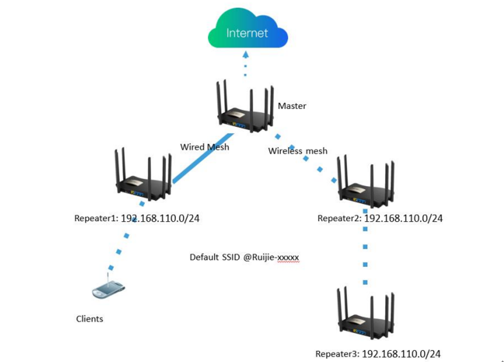 Issue Description: The mesh networking of two Mesh EW devices failed. Note: Ensure that the device in normal use supports the mesh function Model support mesh function: ![]() 2.Topology: ![]() Note: Recommend upgrading the device to the latest version of the firmware 3.Troubleshooting: 1. Make sure Master gets the DHCP IP address from ISPto access the internet, broadcasts default SSID @Ruijie-mxxxx which is used byclients and broadcasts default hidden mesh Wi-Fi to let repeaters connect. 2. Repeater connected with Master using wired or wireless will broadcast the default SSID @Ruijie-mxxx after mesh succeeds. 3. Checkthe current Work Mode of the shave device. Wire connection: ![]() Wireless connection: ![]() 4. Check the distance and the signal strength 1. Put the two APs as close as possible and ensure that the AP s can detect the signals of each other. The Slave device should be within two meters of the Master device 2. The recommended signal strength is higher than –70 dBm. You can move the devices after the mesh network is established. 3. When moving the Slave device to another location, Wi-Fi coverage is required. If more than two walls exist between two devices, the mesh rebuild may fail. 5. If the previous steps do not detect the cause of the mesh formation failure, you can try to capture the packet from the device ![]() |