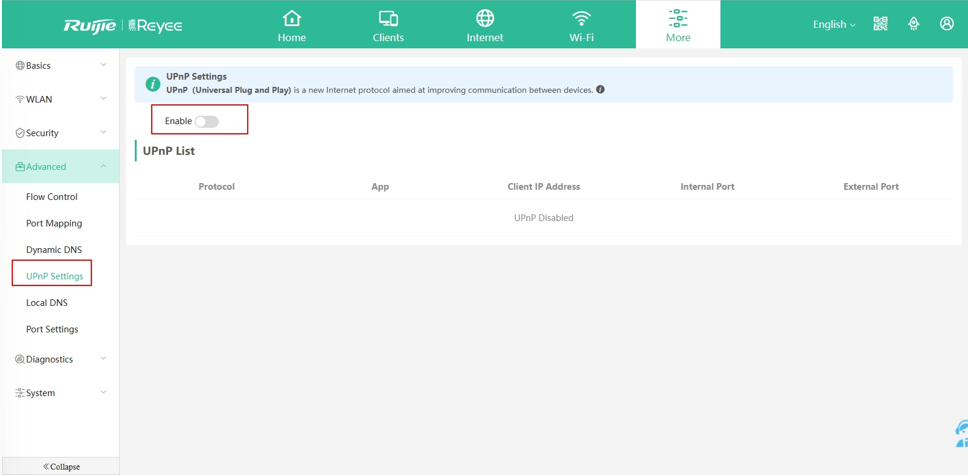 UPnP is a protocol that enables application runningon a host to automatically configure port mapping on the NAT-Router. On theother hand, enabling UPnP may pose potential danger to network security. Thereare three requirements for applying UPnP: 1. The device must be enabled with UPnP. 2. The operating system of the internal host must support UPnP. 3. The application must support UPnP. You can enable UPnP function on this page: ![]() |