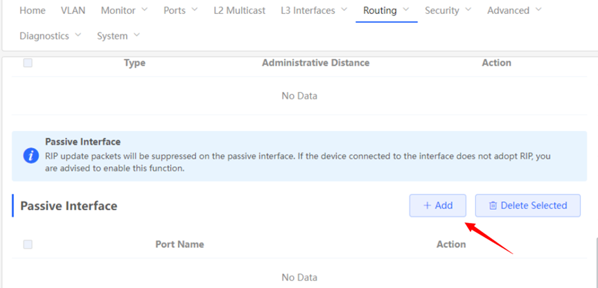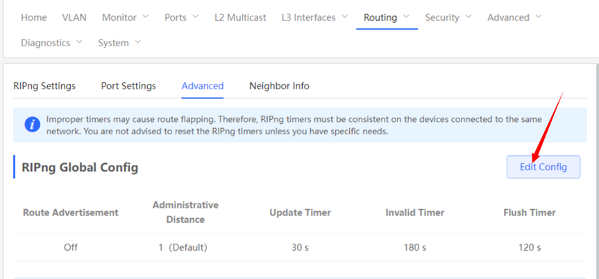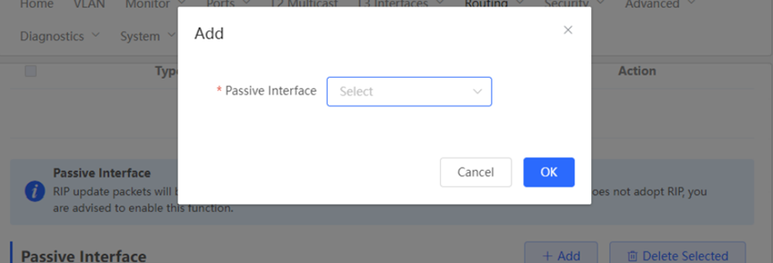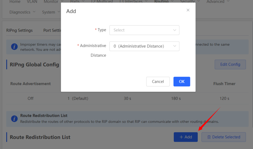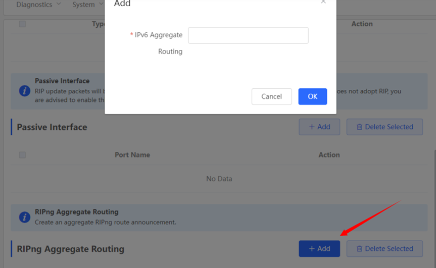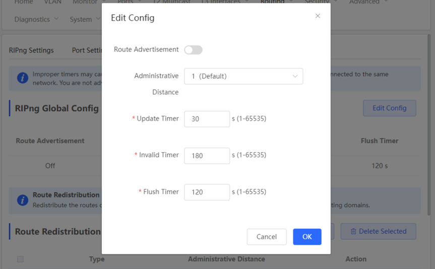 1. Configuring the RIPng Global Configuration You can Click [Device]> [Routing]> [RIPng Settings] > [Advanced], Click [Edit Config] ![]() ![]() Route Advertisement: After route advertisement is enabled, the current device generates a default route and sends it to the neighbor. Administrative Distance: Redistribute routes of other protocols to the RIP domain so that RIP can interwork with other routing domains. Update Timer: RIP update cycle. The routing information is updated every 30 seconds by default. Invalid Timer: If no update is received before a route becomes invalid, the route is considered unreachable. The default value is 180 seconds. Flush Timer: If no update is received before the flush timer of an invalid route expires, the route is completely deleted from the RIP routing table. The default value is 120 seconds. 2. Configuring the RIPng Route Redistribution List You can Click [Device]> [Routing]> [RIPng Settings] > [Advanced], Click [Add] ![]() Type: Direct Routing/ OSPF Routing/ Static Routing Administrative Distance: Value range: 0-16. The default value is 0. 3. Configuring the RIPng Passive Interface You can Click [Device]> [Routing]> [RIPng Settings] > [Advanced], Click [Add],and enter the IP address of the neighbor router. ![]() ![]() 4. Configuring the IPv6 Aggregate Route You can Click [Device]> [Routing]> [RIPng Settings] > [Advanced], Click [Add]. and enter the IPv6 address and prefix length (value range: 0–128). ![]() |