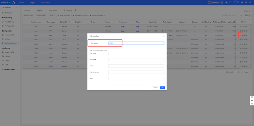 (1) Check if the device or version support Voucher/Account limiting period. RG-EG105GW and some versions of other devices doesn't support period limit. Please check the product datasheet or other related information to check details. (2) Check if the user has configured period limit ![]() ![]() If the product doesn't limit the period,which means the voucher or account band an incorrect user group. Please kick the current user offline and create a new Voucher or Account for the current user, or modify the current Voucher or Account to bind to the correct user group. ![]() ![]() (3) Check if Reyee EG is online properly. If Reyee EG not online on Ruijie Coud, the device configuration can't synchronize to Ruijie Cloud successfully. Please follow this guide to troubleshoot this problem:How to do when Reyee devices cannot go online on the Ruijie Cloud? - Switch - Ruijie Community (ruijienetworks.com) ![]() (4) Check whether the authenticated user‘s online status. lf the user's period limit configuration iscorrenct, but the user still shows “online” status after the limited time, please contact Ruijie TAC support for help: RITA (Ruijie Intelligent Technical Assistant) Note: it;s a normal situation that portal authentication users can still connect to the relevant SSlD after the expiry of the voucher or account,but they cannot access the Internet wirelessly. |