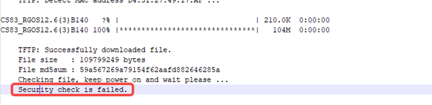 1. From the operation logs, the upgrade mode is incorrectly selected. ‘2. Upgrade main program’ should be selected for a system upgrade. However, ‘1. Upgrade rboot program’ is selected instead. ![]() 2. After 2.Upgrade main program is selected, the upgrade still fails. Check if the version file is complete. (1).Check the MD5 checksum after the version file is uploaded. ![]() (2) Compare it with the value in the release notes. ![]() The two values are inconsistent, indicating that version file may have been damagedduring the upload. 3. Solution Download the version file again and perform the upgrade operation again. The upgrade issuccessful. 4. Appendix: Ctrl+C-based Upgrade for RG-CS83 Series Switches Note: 1. The Ctrl+C-based should only be performed if an upgrade fails or the main program is lost. 2. If send download request is displayed at startup and the device fails to enter user mode, the device software version is likely lost. In this case, the device needs to be upgraded using Ctrl+C. Ⅰ. Application Scenario The main program of the device is lost. The main program can only be recovered using Ctrl+C. Ⅱ. Topology ![]() II. Configuration Notes 1. Use adedicated console cable to log in to the switch, with the baud rate set to 9600. 2.Connect the Ethernet cable to the MGMT port of the switch. (Note: When the switch is connected to the PC via an Ethernet cable, the port status LED on the switch will not light up, and you will not be able to test the connectivity between the PC and the switch. The port status LED will only light up when there is data transmission.) If the switch has a MGMT port, connect the PC tothe MGMT port. If the switch does not have a MGMT port, connect the PC to the first port on the switch. IV. Configuration Procedure 1.Connect the PC to the console port of the switch using a console cable. 2. Use a terminal software (SecureCRT) to log in to the switch. (1) Set the IP address of the PC to 192.168.1.2, put the TFTP software and upgrade file into the same English directory, and open the TFTP software. Note: Disable the built-in firewall on the PC and uninstall any other antivirus software,such as 360 Total Security or Kaspersky, to avoid potential upgrade failures. (2) If the main program is lost, the switch directly enters the Ctrl mode after startup. Alternatively, you can press Ctrl+C to enter the CRTL mode when the switch is powering up. a. During the restart, press Ctrl+C when the following prompt line is displayed to enter the Rboot interface. PressCtrl+B to enter Boot Menu, Press Ctrl+C to enter Rboot 0 Rboot Version: 1.1.15 Mount rootfs1 ... Mount rootfs2 ... Mount data ... Mount upgrade ... Mount upgrade_bak ... ======Rboot Menu (Ctrl+Z to upper level) ====== TOP menu items. ----------------------------------------------------------------------------------------------------------------------------- 0. Tftp utilities. 1. X/Y/ZModem utilities. 2. Run main. 3. SetMac utilities. 4. Scattered utilities. ---------------------------------------------------------------------------------------------------------------------------- Press a key to run the command: b. In the Rboot interface, press the following keys marked in red to access the IP address configuration menu. ======Rboot Menu(Ctrl+Z to upper level) ====== TOP menu items. ------------------------------------------------------------------------------------------------------------------------------ 0. Tftp utilities. 1. XModem utilities. 2. Run main. 3. SetMac utilities. 4. Scattered utilities. --------------------------------------------------------------------------------------------------------------------------- Press a key to run the command: 0 ======Rboot Menu(Ctrl+Z to upper level) ====== Tftp utilities. ------------------------------------------------------------------------------------------------------------------------- 1. Upgrade uboot program. 2. Upgrade rboot program. 3. Upgrade main program. 4. Burn the total Flash ROM by this downloaded file. ---------------------------------------------------------------------------------------------------------------------- Press a key to run the command: 2 enter the Local IP:[]: ----------------------------------------------------------------------------------------------------------------------- c. In the IP address configuration menu, enter the switch IP address, PC IP address, and upgrade file name as prompted. Press a key to run the command: enter the Local IP:[]:192.12.1.1 // Enter the IP address of the switch, ensuring it is on the same subnet as the PC’s IP address. enter the Remote IP:[]:192.12.1.2 //Enter the IP address of the PC. enter the Filename:[]: S5760X_RGOS12.3(1)B0701_install.bin //Enter the name of the upgrade file. Thefile name provided here is just an example. d. After the IP addresses and file name are configured, the upgrade process starts. %Total % Received % Xferd Average Speed Time Time Time Current Dload Upload Total Spent Left Speed 147M 100 147M 0 0 1902k 0 0:01:19 0:01:19 --:--:-- 1968k 100 147M 100 147M 0 0 1902k 0 0:01:19 0:01:19 --:--:-- 1902k Upgrading, keep power on and wait please ... e. Select Y when prompted to continue until the upgrade is successful, that is, the upgrade file is copied successfully. Determined to upgrade? [Y/N]: Y Mount File System ... Copy file to Flash ... Upgrade Rootfs Success. Upgrade Success d. Once theupgrade file has been successfully copied, the system will automatically return to the Rboot interface. Press Ctrl+Z to exit and reboot the device, or alternatively, you can power the device off and then back on to reboot it. ======Rboot Menu(Ctrl+Zto upper level) ====== Tftp utilities. ---------------------------------------------------------------------------------------------------------- 0. Upgrade uboot program. 1. Upgrade rboot program. 2. Upgrade main program. 3. Burn the total FlashROM by this downloaded file. ----------------------------------------------------------------