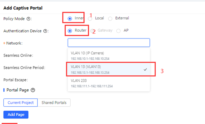 1. Click [Project]-->[Auth&Accounts]-->[Captive portal]![]() 2. Click [Inner]-->[Router] And choose the VLAN(Ip range) you want to enable the portal authentication ![]() 3. Click [Add page] Then you can configure authentication mode and portal style ![]() ![]() 4. Check whether the portal status and VLAN (ip range) is correct ![]() |