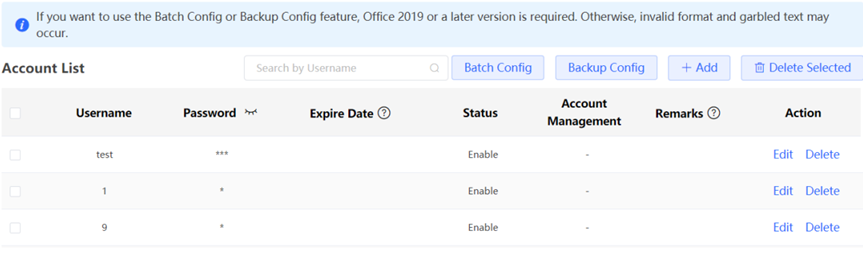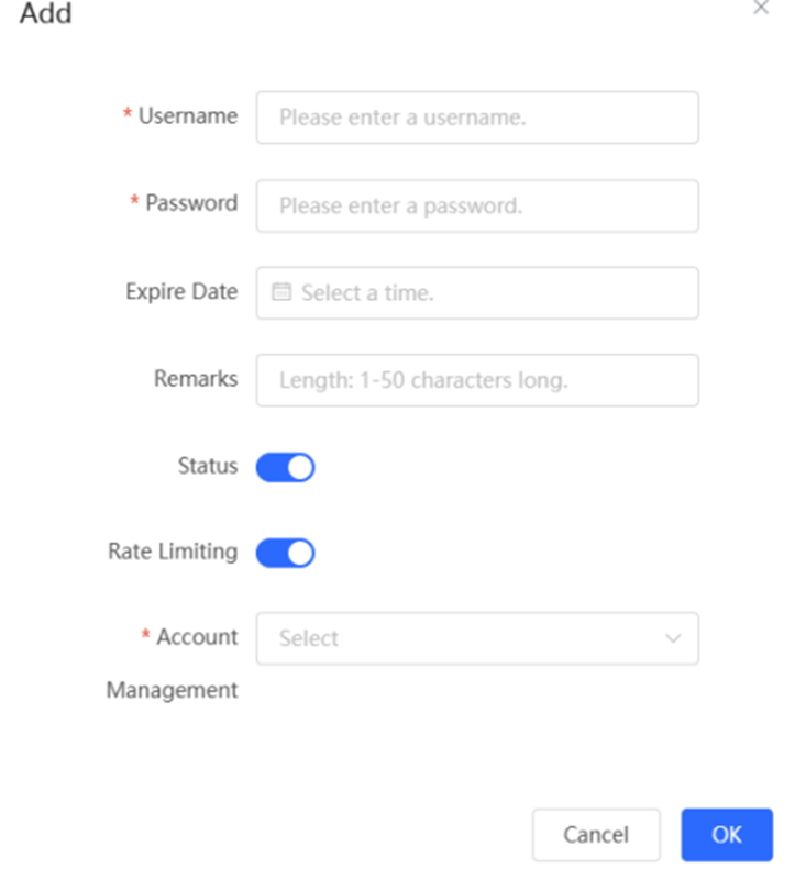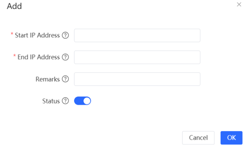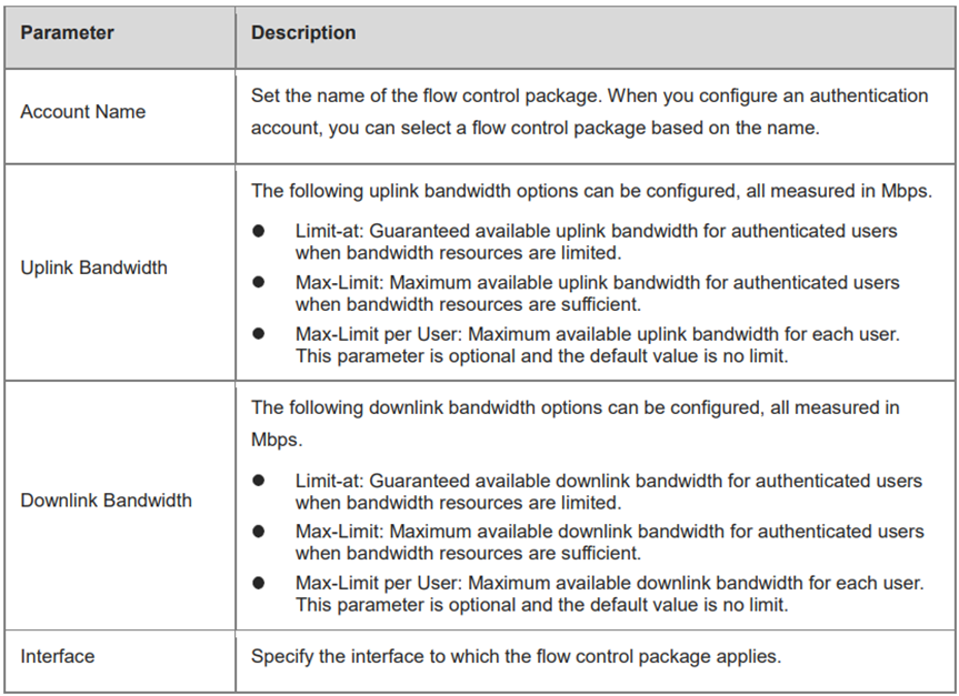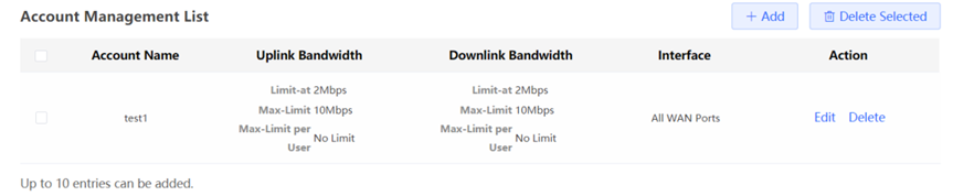Overview Point-to-Point Protocol over Ethernet (PPPoE) is a network tunneling protocol that encapsulates PPP frames inside Ethernet frames. When the router functions as a PPPoE server, it provides the access service to LAN users and supports bandwidth management. Global Settings Choose One-Device > Gateway > Config >Advanced > PPPoE Server > Global Settings. Set PPPoE Server to Enable and configure PPPoE server parameters ![]() ![]() ![]() Configuring a PPPoE User Account Choose One-Device > Gateway > Config >Advanced > PPPoE Server > Account Settings Click Add to create a PPPoE authentication user account. The currently created PPPoE authentication user accounts are displayed in the Account List section. Find the target account and click Edit to modify the account information. Find the target account and click Delete to delete the account. ![]() ![]() ![]() Configuring a Flow Control Package Choose One-Device > Gateway > Config >Advanced > PPPoE Server > Account Management If smart flow control is disabled, the flow control package for the account does not take effect. Before you configure a flow control package, enable smart flow control first. Click Add to create a flow control package. The currently created flow control packages are displayed in the Account Management List section. You can modify or delete the packages. ![]() ![]() ![]() Configuring Exceptional IP Addresses Choose One-Device > Gateway > Config >Advanced > PPPoE Server > Exceptional IP Address. When the PPPoE server is enabled, if you want to allow some IP addresses in a specific VLAN to access the Internet without passing account and password authentication, you can configure these IP addresses as exceptional IP addresses. The currently created exceptional IP addresses are displayed in the Exceptional IP Address List section. Click Edit to modify the exceptional IP address. Click Delete to delete the exceptional IP address. ![]() ![]()