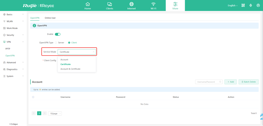 Reyee mesh routers support server mode and client mode. In client mode, a Reyee mesh router works as an OpenVPN client to connectto the VPN server. 1. Choose More > VPN > OpenVPN. ![]() Currently, this device supports Import Config, through which the configuration file is manually imported for docking with the server that is similar to this device. The client configuration file client.ovpn can be directly exported from the docked OpenVPN server. 2. Click Enable to enable the OpenVPN function. Configure OpenVPN Type as Client. ![]() 3. Configure the Server Mode. ![]() The device supports three authentication modes: Account, Certificate, and Account & Certificate. Account mode : The correct account, password, and CA certificate are required to connect to the server, where the CA certificate information is embedded in the client's configuration file. Certificate mode : The client needs the correct CA certificate, client certificate, and pre-shared key to connect to the server, which are all embedded in the client's configuration file. Account & Certificate mode :The client needs the correct account, password, CA certificate, client certificate, and pre-shared key to connect to the server, where the CA certificate information, client certificate, and pre-shared key are embedded in the client's configuration file. 4. Click Browse and select the client configuration file with the suffix .ovpn to import the client configuration file. ![]() 5. Click Save to save the configuration. |
