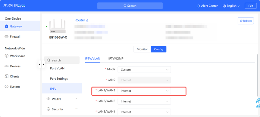 1. Enter the eweb of EG105GW-X:![]() 2. Select Network > IPTV ![]() 3. Select the LAN port that's connected to the IPTV server ![]() 4. Choose IPTV mode on the LAN port: ![]() 5. Input the VLAN id for your IPTV network and click save to finish configuration: ![]() |